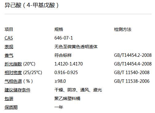 Name:Isohexanoic acid(4-Methylvaleric acid) Description: Item Specification Test method CAS 646-07-1 APPEARANCE Clear colorless to pale yellow clear liquid ODOR Conform to standard GB/T14454.2-2008 REFRACTIVE INDEX (20℃) 1.4120-1.4170 GB/T14454.4-2008 SPECIFIC GRAVITY (25/25 ℃) 0.916-0.925 GB/T 11540-2008 G.C. (%) ≥98.0 GB/T 11538-2006 RECOMMENDED STORAGE CONDITION Dry, cool, ventilative, away from direct sunlight PACKING PE plastics drum SHELF LIFE One year Previous:Tabanone Next:4-dione [Return]