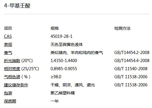 Name:4-Methylnonanoic acid Description: Item Specification Test method CAS 45019-28-1 APPEARANCE Colorless to pale yellow clear liquid ODOR Meaty pork lamb chicken odor GB/T14454.2-2008 REFRACTIVE INDEX (20℃) 1.4350-1.4400 GB/T14454.4-2008 SPECIFIC GRAVITY (25/25 ℃) 0.8985-0.9055 GB/T 11540-2008 G.C. (%) ≥98.0 GB/T 11538-2006 RECOMMENDED STORAGE CONDITION Dry, cool, ventilative, away from direct sunlight PACKING PE plastics drum SHELF LIFE One year Previous:Geranyl Butyrate Next:2,6,6Trimethylcyclohex-ene-1 [Return]