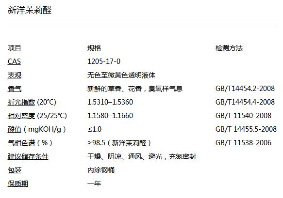 Name:Helional Description: Item Specification Test method CAS 1205-17-0 APPEARANCE Colorless to yellowish clear liquid ODOR Fresh green, floral, ozone note GB/T14454.2-2008 REFRACTIVE INDEX (20 ℃) 1.5310-1.5360 GB/T14454.4-2008 SPECIFIC GRAVITY (25/25 ℃) 1.1580-1.1660 GB/T 11540-2008 ACID VALUE( mgKOH/g) ≤1.0 GB/T 14455.5-2008 G.C. (%) ≥98.5(helional) GB/T 11538-2006 RECOMMENDED STORAGE CONDITION Dry, cool, ventilative, away from direct sunlight,sealed with nitrogen PACKING Steel drum with inner coat SHELF LIFE One year Next:十一醛二乙缩醛 [Return]