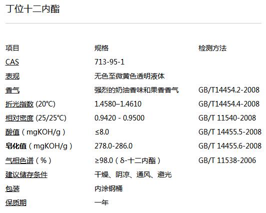 Name:Delta Dodecalactone Description: Item Specification Test method CAS 713-95-1 APPEARANCE Colorless to yellowish clear liquid ODOR Strong Creamy, fruity GB/T14454.2-2008 REFRACTIVE INDEX (20 ℃) 1.4580-1.4610 GB/T14454.4-2008 SPECIFIC GRAVITY (25/25 ℃) 0.9420-0.9500 GB/T 11540-2008 ACID VALUE( mgKOH/g) SAPONIFICATION VALUE(mgKOH/g) ≤8.0 278.0-286.0 GB/T 14455.5-2008 GB/T 14455.6-2008 G.C. (%) ≥98.0(delta dodecalactone) GB/T 11538-2006 RECOMMENDED STORAGE CONDITION Dry, cool, ventilative, away from direct sunlight, sealed with nitrogen PACKING Steel drum with inner coat SHELF LIFE One year Previous:4-Methyloctanoic acid Next:Isohexanoic acid(4-Methylvaleric acid) [Return]
