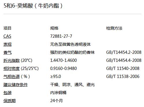 Name:5(6)-decenoic acid Description: Item Specification Test method CAS 72881-27-7 APPEARANCE Colorless to pale yellow clear liquid ODOR Powerful mike cheese-like GB/T14454.2-2008 REFRACTIVE INDEX (20℃) 1.4470-1.4600 GB/T14454.4-2008 SPECIFIC GRAVITY (25/25 ℃) 0.9160-0.9480 GB/T 11540-2008 G.C. (%) ≥95.0 GB/T 11538-2006 RECOMMENDED STORAGE CONDITION Dry, cool, ventilative, away from direct sunlight PACKING Steel drum with inner coat SHELF LIFE 24 Months Previous:4-dione Next:4-Methylnonanoic acid [Return]