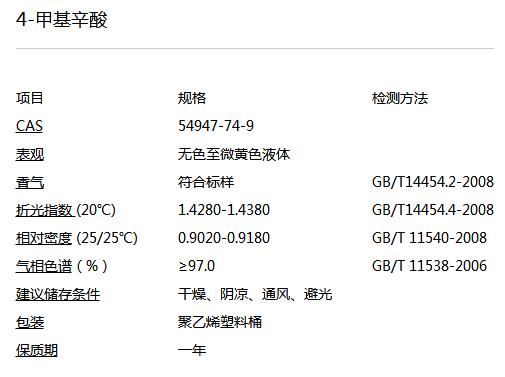 Name:4-Methyloctanoic acid Description: Item Specification Test method CAS 54947-74-9 APPEARANCE Colorless to pale yellow clear liquid ODOR Conform to standard GB/T14454.2-2008 REFRACTIVE INDEX (20℃) 1.4280-1.4380 GB/T14454.4-2008 SPECIFIC GRAVITY (25/25 ℃) 0.9020-0.9180 GB/T 11540-2008 G.C. (%) ≥97.0 GB/T 11538-2006 RECOMMENDED STORAGE CONDITION Dry, cool, ventilative, away from direct sunlight PACKING PE plastics drum SHELF LIFE One year Previous:Butyl butyryllactate Next:Tabanone [Return]